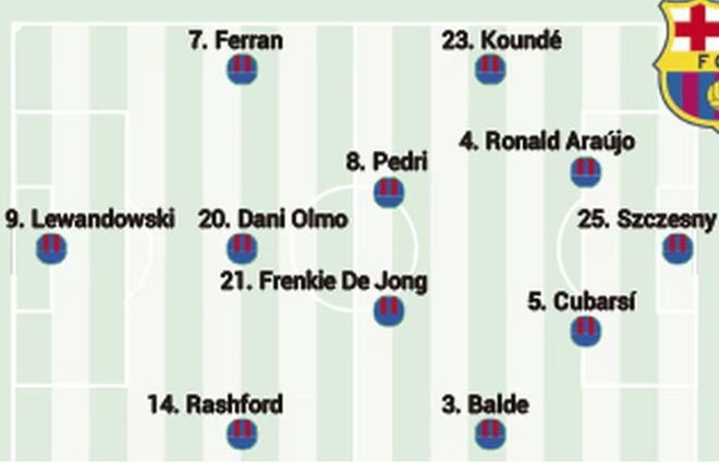 雷速体育10月5日讯 巴塞罗那将于北京时间今晚22:15前往客场挑战塞维利亚。赛前,《阿斯报》发文预测了巴萨本场比赛的首发阵容。已确定伤缺2-3周的亚马尔并没有出现在这个阵容中。此外,《阿斯报》预测巴尔德将取代马丁出任左后卫,而莱万和费兰将一齐先发。