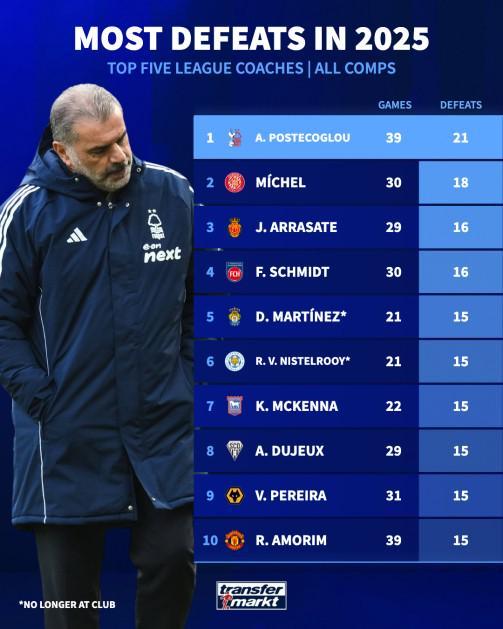 五大联赛2025年输球最多主帅:澳波39战21负第1,阿莫林第10