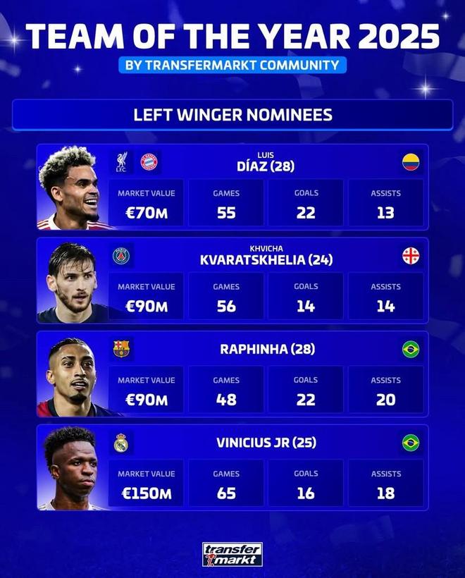 北京时间12月5日,正在评选2025年度最佳阵容的德转列出了最佳左边锋的四名候选者,拜仁慕尼黑的路易斯-迪亚斯、巴黎圣日耳曼的克瓦拉茨赫利亚、巴塞罗那的拉菲尼亚以及皇家马德里的维尼修斯上榜。